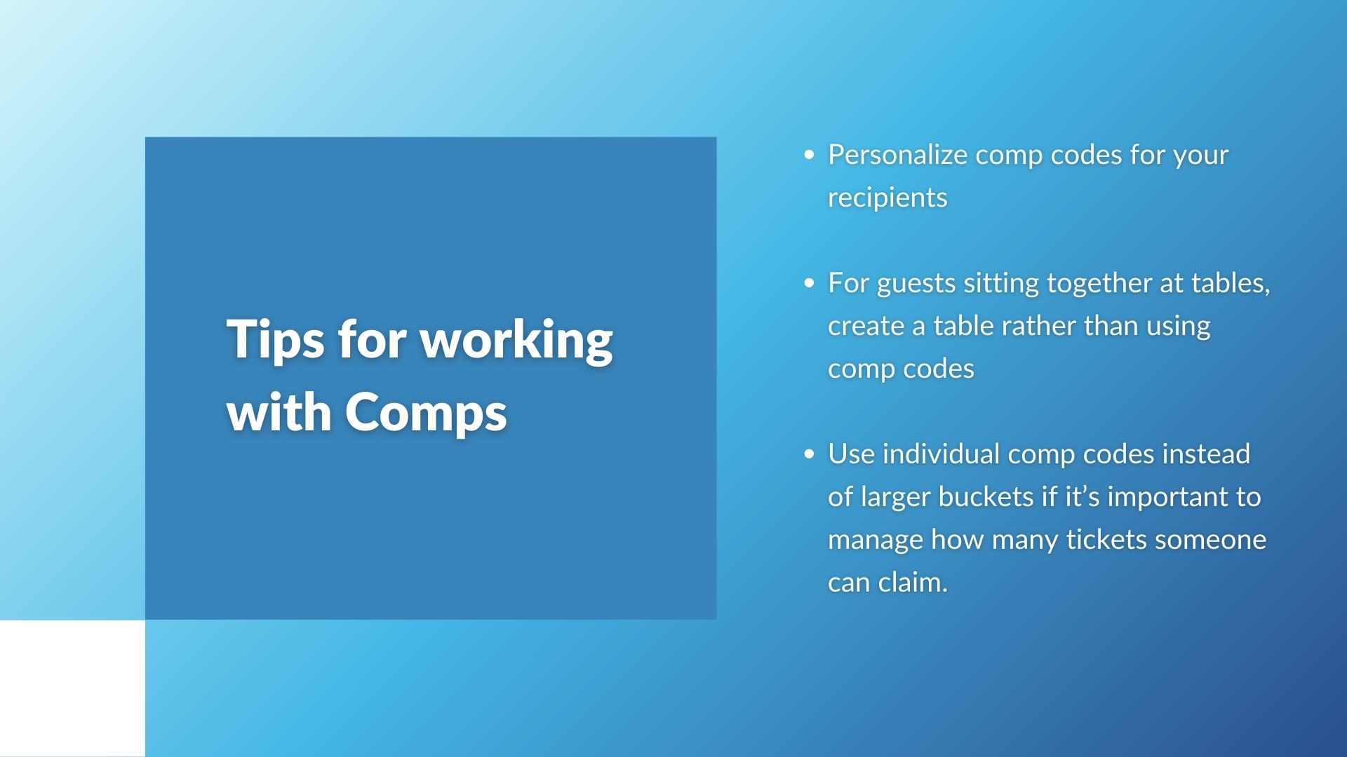 Use comp codes to issue free tickets to special groups of people like board members, VIPs, speakers, volunteers, and staff.